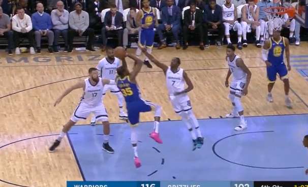 虎扑3月28日讯 勇士客场对灰熊比赛第四节末,勇士前锋凯文-杜兰特左手变向突破双手扣篮打成2+1,随后杜兰特背打防守金鸡独立后仰跳投得手。