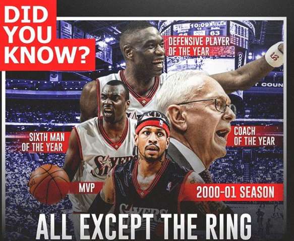 在2001年,76人后卫阿伦-艾弗森获得最有价值球员奖、迪肯贝-穆托姆博获最佳防守球员,阿隆-麦基获最佳第六人,拉里-布朗获最佳教练。最终76人杀进总决赛,以1-4不敌湖人。
